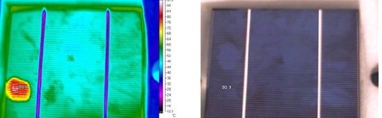 2 拍攝時(shí)應(yīng)該將組件在正常的太陽(yáng)光或輔助光源下工作,或?qū)⒔M件在上述光源的照射下短路,否則熱斑不會(huì)出現(xiàn)。