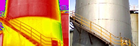 儲(chǔ)罐雖然有液位計(jì)對(duì)液位進(jìn)行控制,但液位計(jì)的失靈會(huì)導(dǎo)致空罐和滿罐,使生產(chǎn)突然中斷或造成儲(chǔ)罐溢出事故,造成巨大損失;紅外熱像儀可以直接在外表面拍攝出液位線,幫助設(shè)備維護(hù)人員及時(shí)發(fā)現(xiàn)有故障的液位計(jì),或者對(duì)存儲(chǔ)容量有明顯偏差的罐體進(jìn)行深入檢測(cè),避免潛在的危險(xiǎn)。