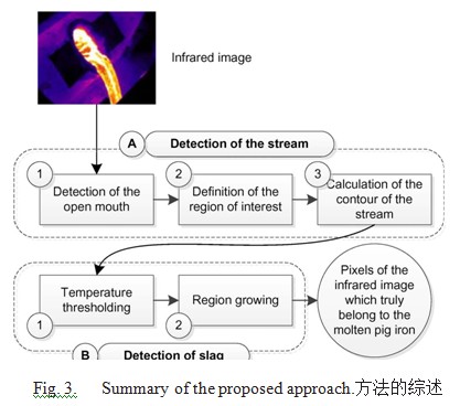 • 2示了鐵水流從魚(yú)雷車(chē)倒入鋼包時(shí)的紅外圖像。圖像出自西班牙AviléArcelorMit- tal煉鋼廠。 一般情況下,根據(jù)溫度的不同在圖像中鐵水能被明顯區(qū)分出來(lái),不過(guò),為了準(zhǔn)確的測(cè)量溫度,十分有必要確認(rèn)哪些像素真正屬于鐵水。本測(cè)量方法是基于檢測(cè)鐵水流位置和消除因覆蓋在鐵水上的熔渣所形成的溫度區(qū)域。之所以確定鐵水流位置是為了避免可視范圍內(nèi)其他熱源的干擾。比如附近的魚(yú)雷車(chē)。清除掉鐵水范圍內(nèi)以高溫呈現(xiàn)的溶渣影像是為了避免在最終溫度計(jì)算中出現(xiàn)錯(cuò)誤。