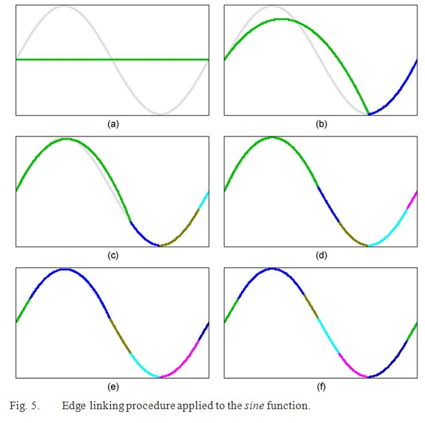 5顯示邊緣連接程序是如何運(yùn)用在正弦函數(shù)上的。第一步,設(shè)一條符合正弦函數(shù)的直線,然后這條線會(huì)在近似和正弦函數(shù)間最大的區(qū)別出現(xiàn)時(shí)被分解為兩個(gè)子分段(正弦波的最低值),在接下來(lái)的步驟中可以看出來(lái)每段都出現(xiàn)兩個(gè)新函數(shù)。接下來(lái)直到正弦函數(shù)正確安裝,短段才停止分裂。這種情況下,七段足夠了,就像看到的,每個(gè)組段都能精準(zhǔn)描述正弦函數(shù)的輪廓。