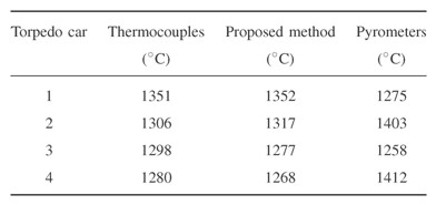 表一顯示了通過四輛魚雷車使用熱電偶(侵泡法),測溫計和本文提出的方法進行鐵水溫度測量的結果。
